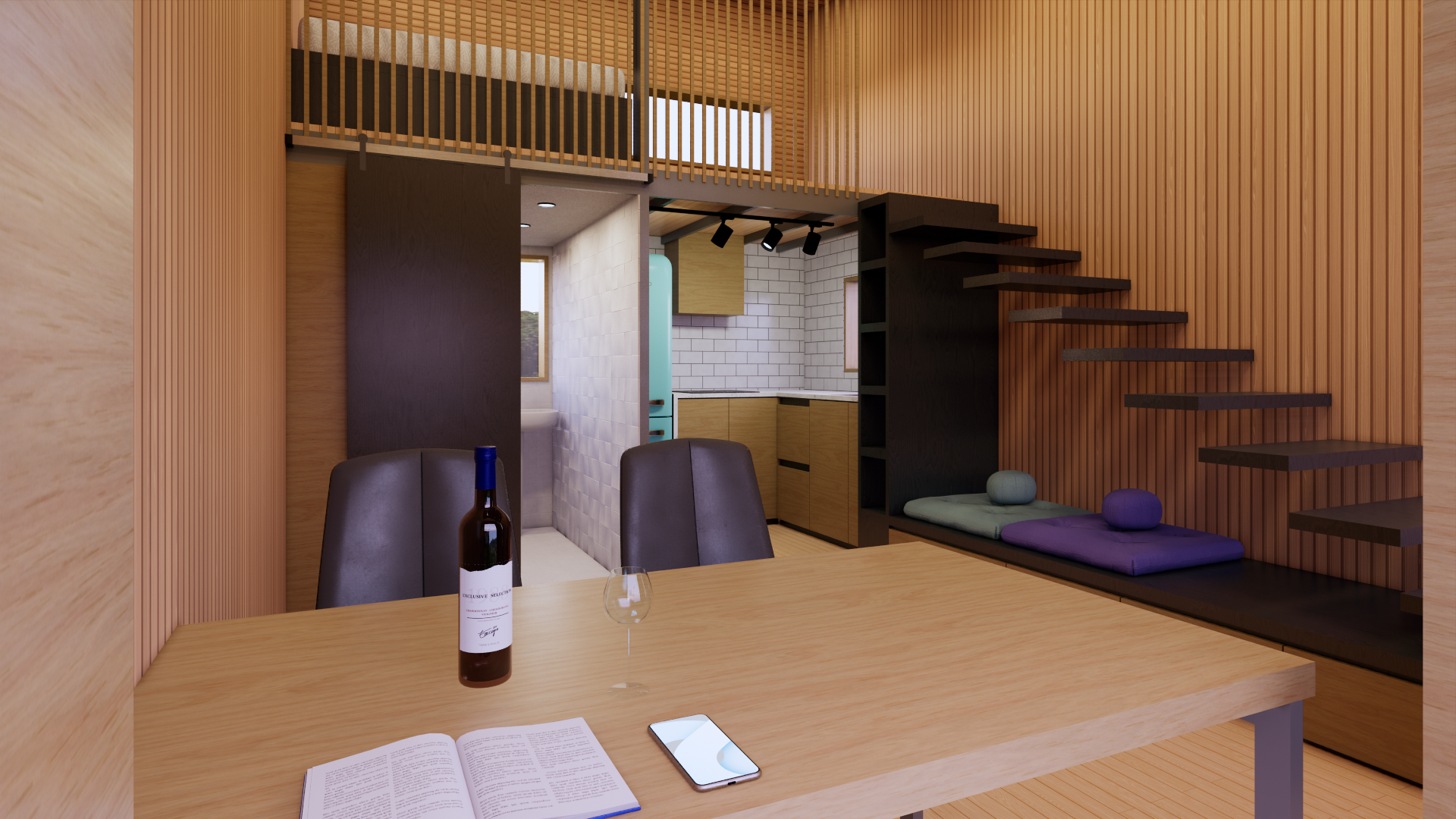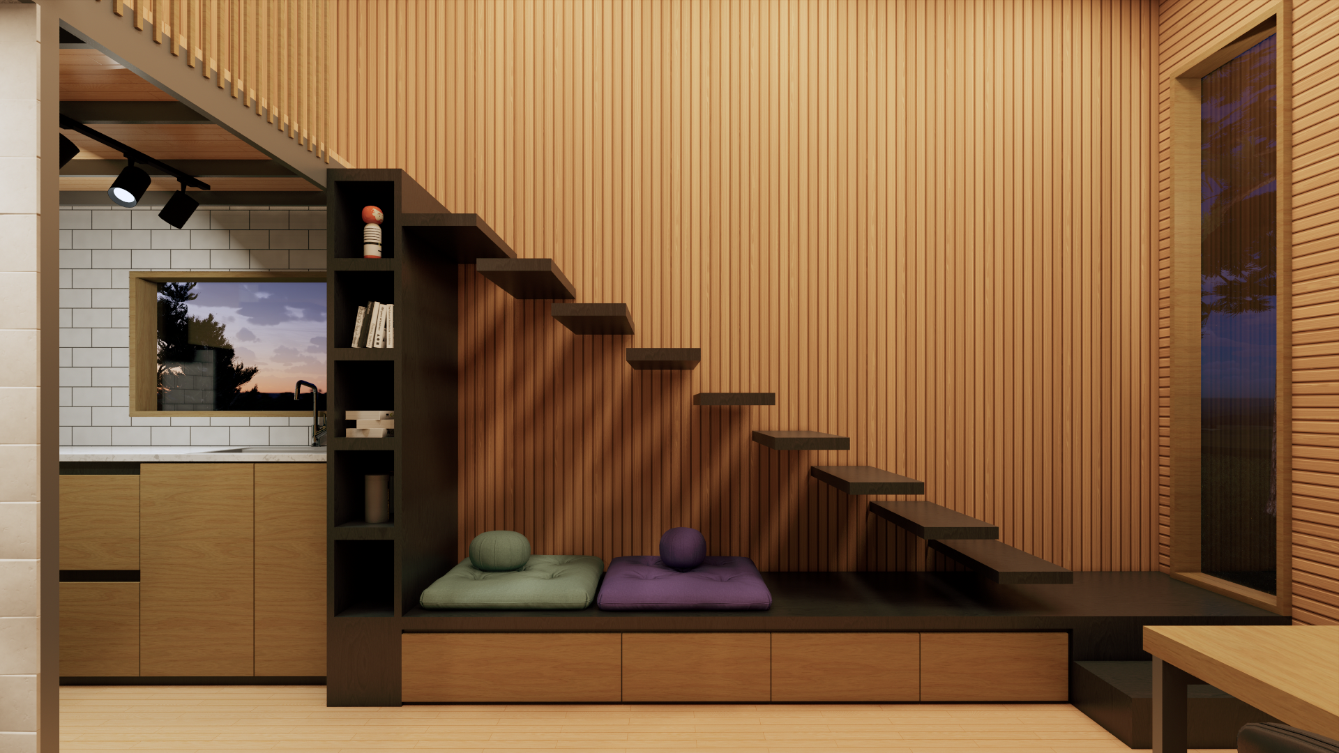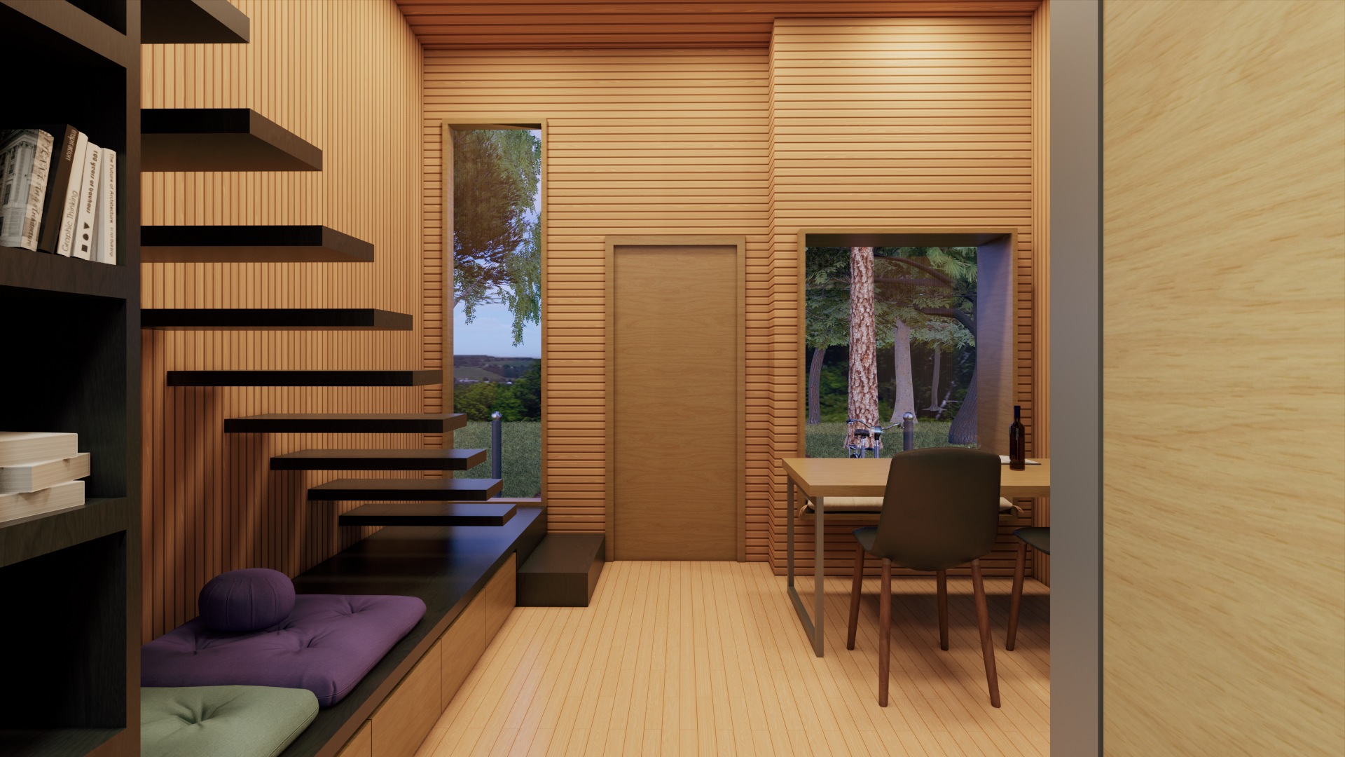 Hermosa cabaña de 43m2 de fachada tipo container y sus interiores de madera para dar mayor confort térmico a sus dueños, sus espacios han sido diseñados para aprovechar la entrada de luz natural, así como también se han destinado espacios específicos del proyecto a grandes ventanas que permiten apreciar el entorno natural, generando la impresión de estar en la misma naturaleza mientras realizas tus actividades diarias como comer o leer un libro, asimismo su diseño de distribución espacial ha sido pensada para no desperdiciar ni un centímetro.