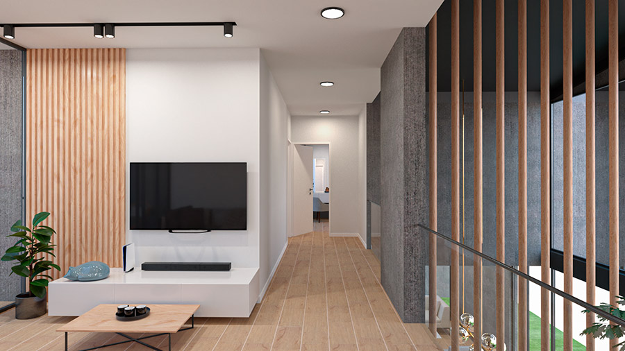 Se distribuye en dos pisos: En su nivel superior se encuentran las habitaciones y espacios de uso más privado; y su planta baja, que busca eliminar las barreras y sus espacios sociales se encuentran interconectados física y visualmente, además cuenta con un patio interior a doble altura que se ubica envolviendo la escalera que lleva el segundo nivel de la casa.